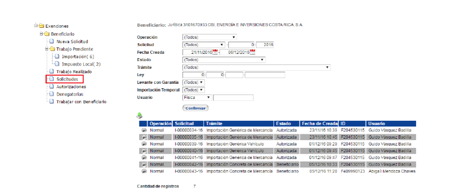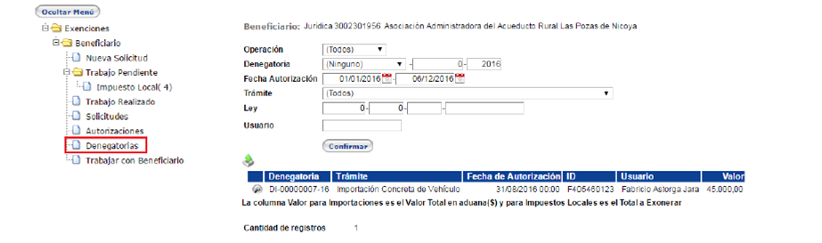 Una vez completado el proceso de registro del beneficiario se entra al
