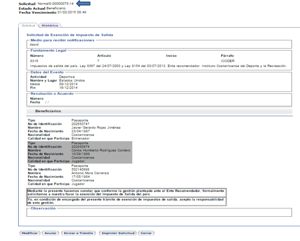 El sistema le asignará un número de solicitud; en este caso: 907. En la