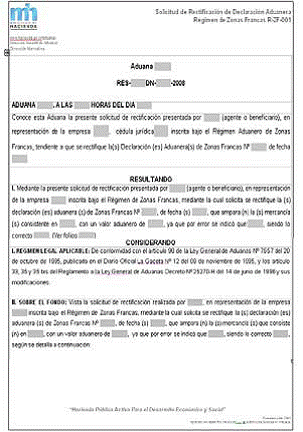 Asímismo, se aclara que "la gestión de rectificación tramitada mediante el Formulario R-ZF-001 deberá ser presentada ante la aduana únicamente en forma electrónica, esto por los medios normalmente utilizados, a saber CD, dispositivo de almacenamiento USB, correo electrónico, disckette o cualquier otro medio electrónico legal que acuerde la aduana respectiva. Respecto al formulario de solicitud adicionado mediante directriz DIR-DN-05-2008-A, se mantiene su presentación en forma física ante la aduana".  Dicha directriz contiene formulario y puede se consultada en el Sistema")