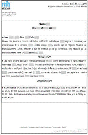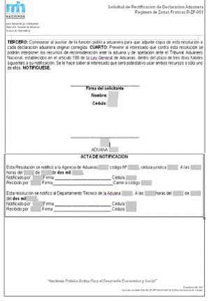 Una vez presentado el formulario de rectificación debidamente lleno, firmado y con los documentos adjuntos que sustentan la rectificación de la(s) declaración(es) aduanera(s), el funcionario aduanero procederá a realizar el análisis de la información contenida en la solicitud de rectificación, y corroborará que la información proporcionada sea la correcta. De ser así, le asignará al formulario un número de resolución y trasladará el mismo para la respectiva firma del Gerente de la Aduana. Una vez firmada la resolución, el funcionario aduanero se encargará de notificar la resolución al departamento técnico de la aduana y al auxiliar de la función pública.