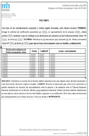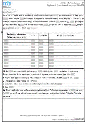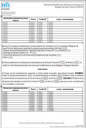 El auxiliar de la función pública aduanera o el beneficiario de los regímenes de perfeccionamiento activo y/o de zonas francas, procederá a completar los formularios para efectuar la rectificación de la declaración aduanera, sea del régimen de perfeccionamiento activo o de zonas francas, mismos que se encuentran en la página web del Ministerio de Hacienda. (Anexo I y II de la presente Directriz).